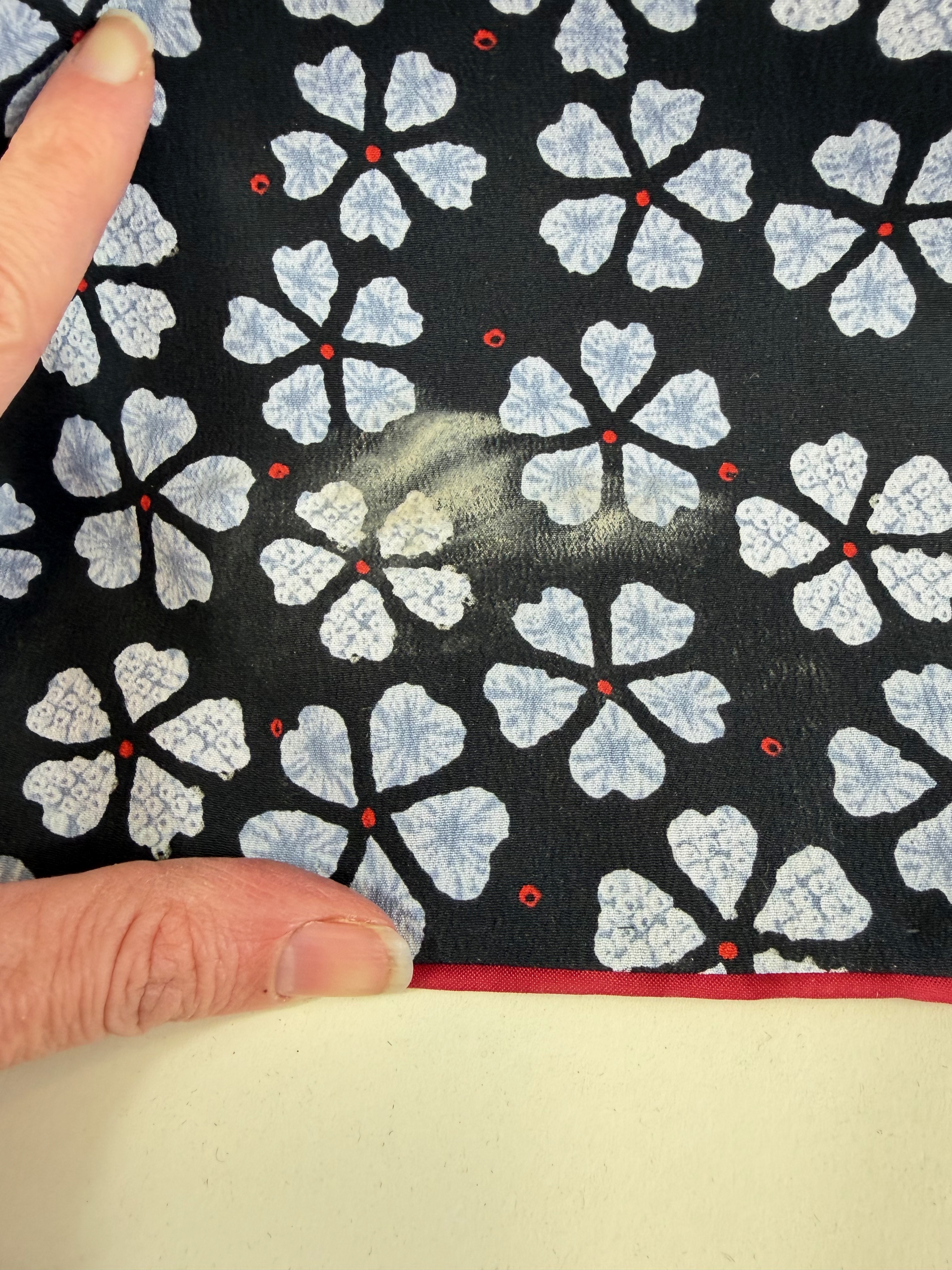 B/W 48″, stain at hem, basting stitches still present & loose, see photos
